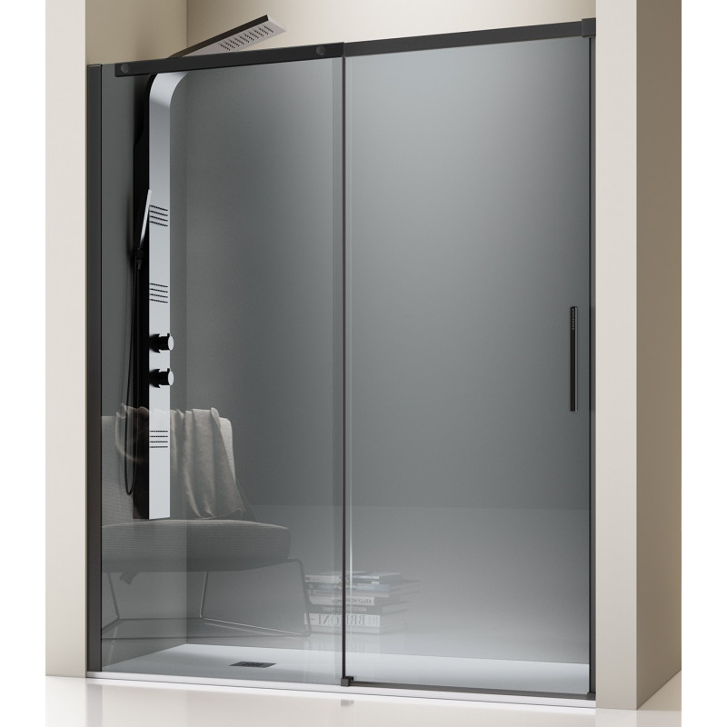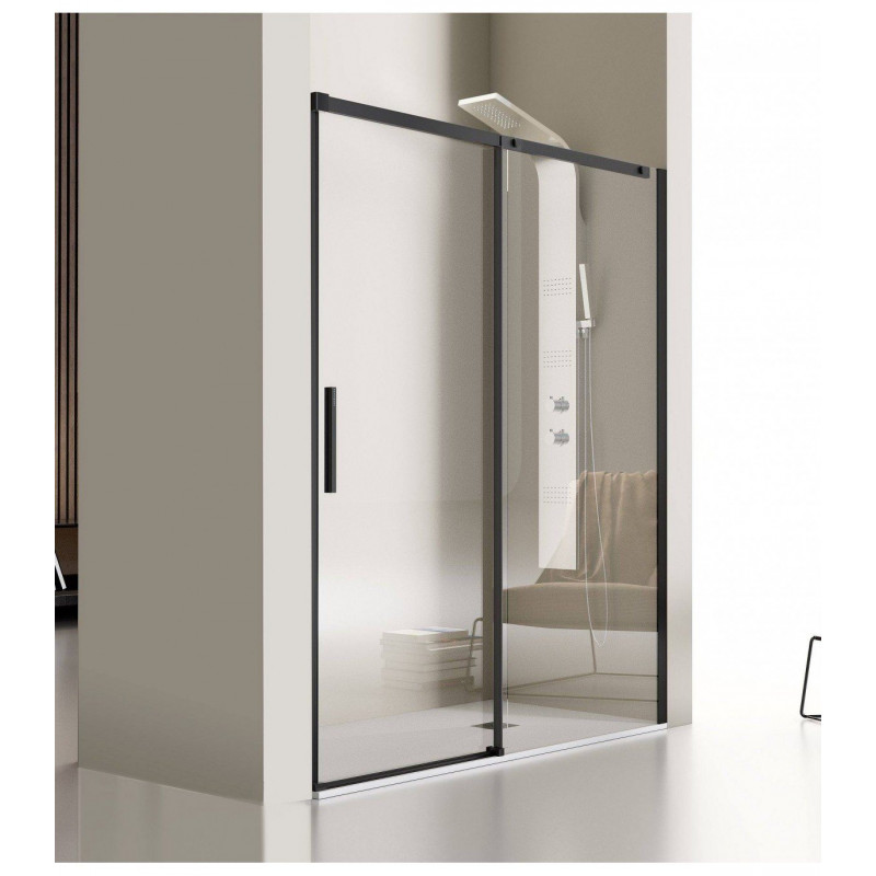 Perfil negro mate. Reversible. Altura 195 cm. Liberación inferior de puertas para una cómoda limpieza. Sin rodamientos en la parte inferior y perfilería mínima. Cristales de 8 mm. templados de seguridad con tratamiento hidrófugo Easy Clean. Solape de hojas entre 1,5 y 5,5 cm. El lateral fijo (opcional) sólo se monta en el lado de cierre de la mampara. Entrega media entre 3 y 5 días laborables.