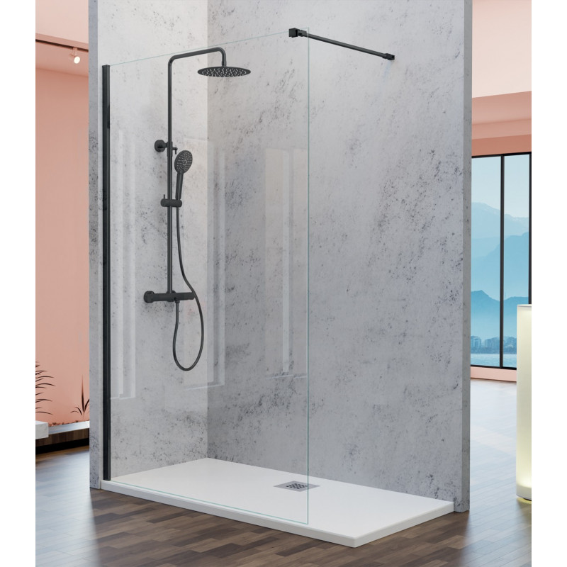 Perfil negro mate. Reversible. Altura 1950 mm. Barra estabilizadora articulada negra de 100 cm. recortable incluida. Cristal de 8 mm. templado de seguridad con tratamiento hidrófugo Easy Clean. Entrega media entre 3 y 5 días laborables.